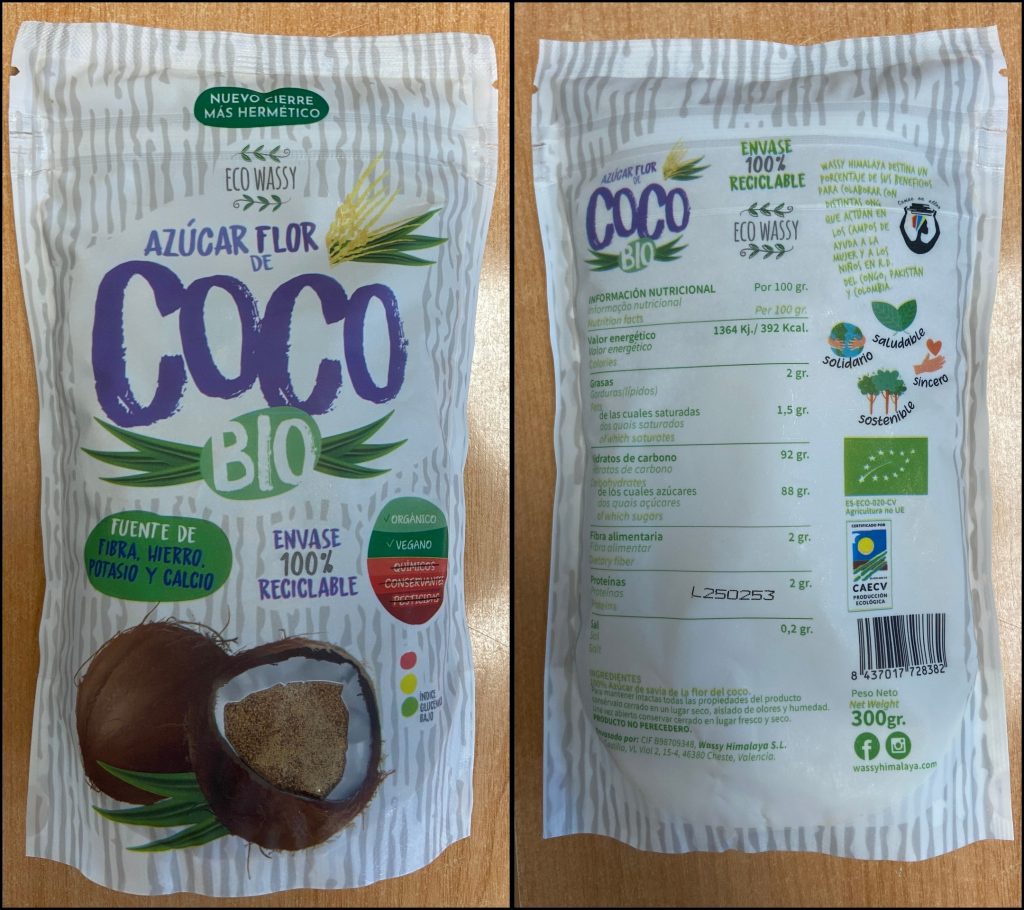 Advertencia para personas con intolerancia a los sulfitos: presencia de sulfitos no declarados en el etiquetado del endulzante natural Azúcar Flor de Coco BIO ECOWASSY, procedente de Indonesia.